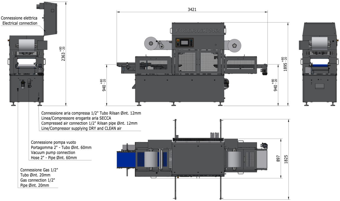 The FP 1465 is primarly constructed of stainless steel and anodized aluminum, so that it can be used in wet environments (IP 65 protection class). All the working surfaces, protection doors and the electrical cabinet are sited on top of the machiney to prevent water or liquid stagnation. For ease of operation and washing front and rear doors of the machine have been designed to give immediate access to all areas.