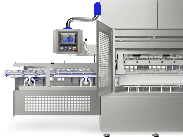 FOODPACK Hyper Tray Sealer is a new concept in-line Tray Sealer resulting in 60+ years of professional engineering experience and continuous research and development. All the main movements are mechanical and driven by servo motors. With the Hyper models technology and engineers, customers can expect the highest level of production throughput with minimal film scrap waste, thanks to the newly engineered tooling. The movement of the containers towards the area of sealing takes place through high precision, continuous motion technology. This process takes place by a set of transport jaws working in complete synergy with the infeed belt and picking up the containers and transporting them inside the area of sealing, without deceleration of speed. In the station of sealing servo technology guarantees precision, speed of execution, reduced maintenance and no compressed air consumption. The film tensioning is automatic and electronically controlled, and mould changeover has been made easier than ever before.