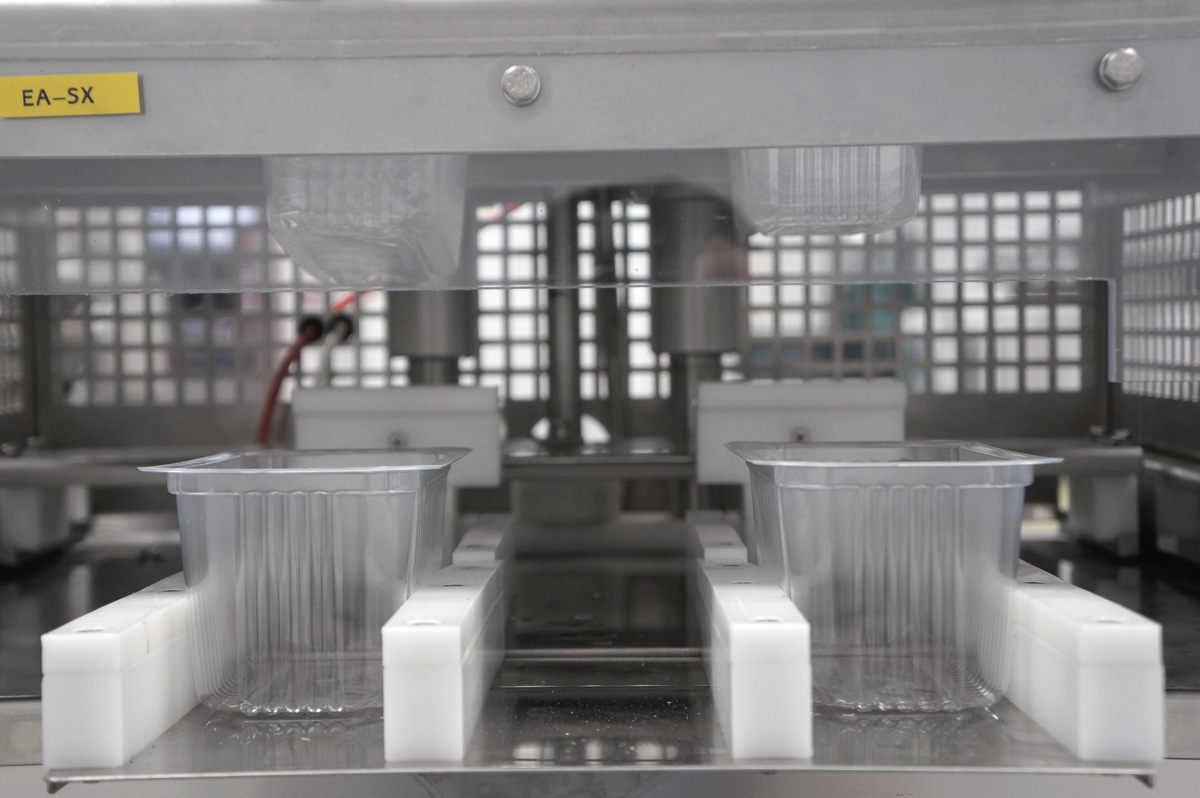 This is a pneumatically operated system which operates with suction cups to pull the trays down from their storage, which is the pushed forward onto the line by one or two pushers.